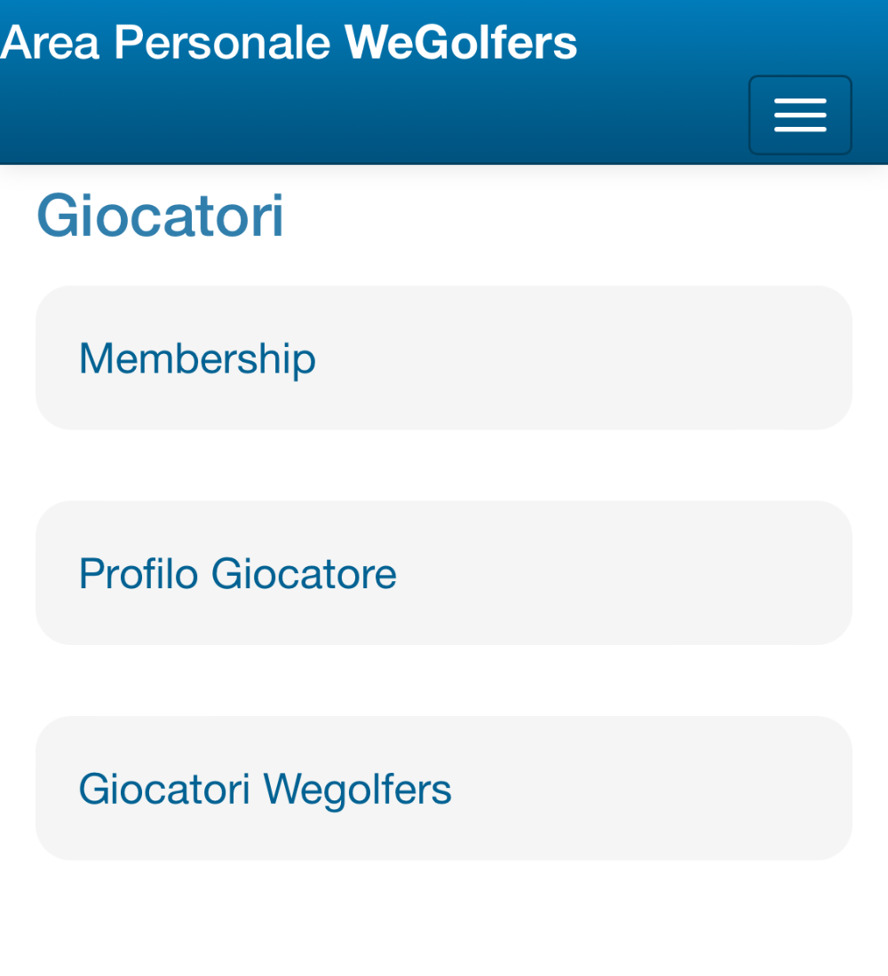 L’area personale è raggiungibile dal sito Wegolfers.com (menù principale), da Wegolfers Club House (menù principale di sinistra) e dall’App Wegolfers (tasto dedicato nel menù in home)